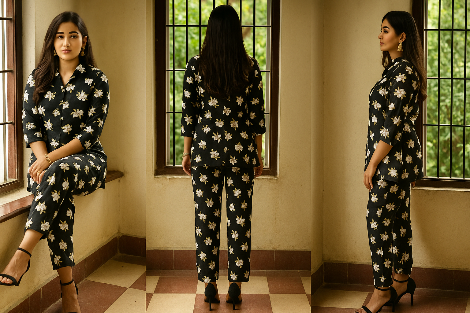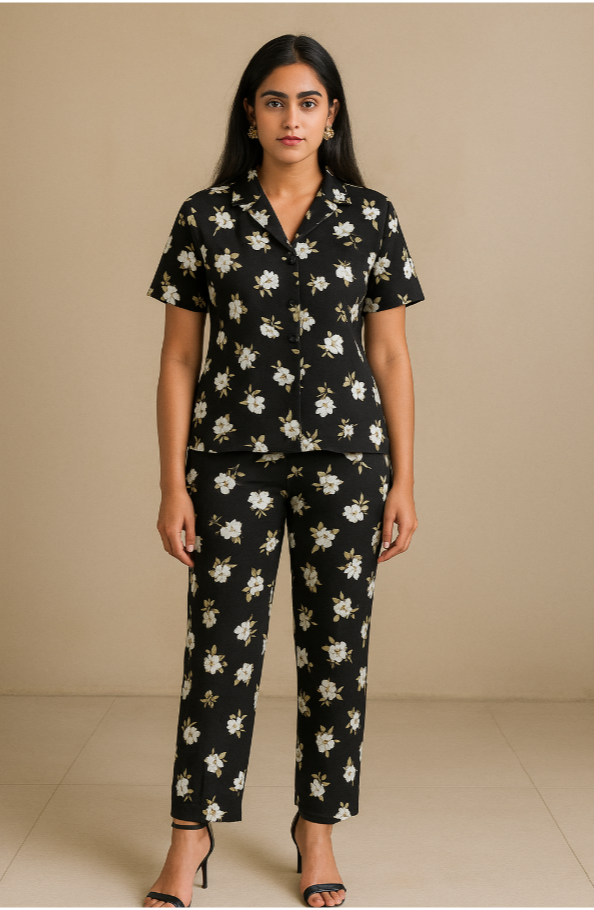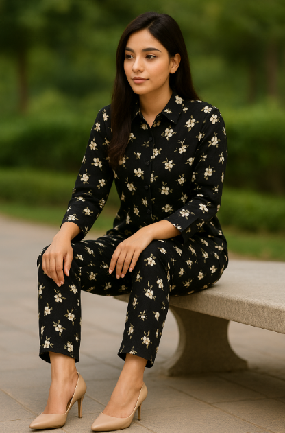 Step into effortless style with this chic and versatile black floral cord set. Designed using soft and breathable fabric, the set features a classic black base adorned with dainty white flowers and soft beige detailing — a timeless combination that adds grace and charm to your everyday and semi-formal look.