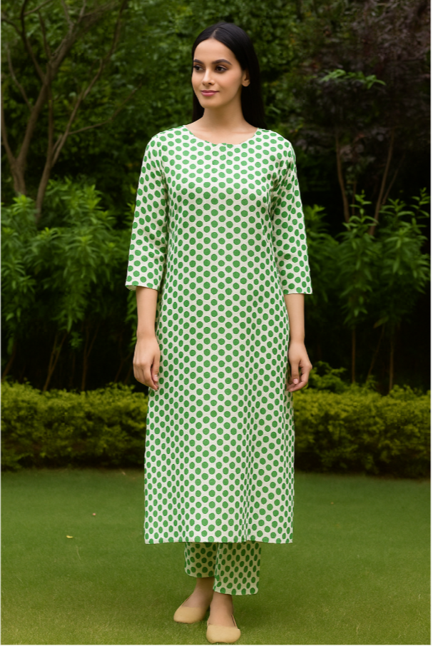 Add timeless charm to your wardrobe with this unstitched fabric featuring an elegant polka dot pattern. Designed with green and pastel pink dots on a white background, this fabric is perfect for crafting chic kurtis, tunics, and tops.